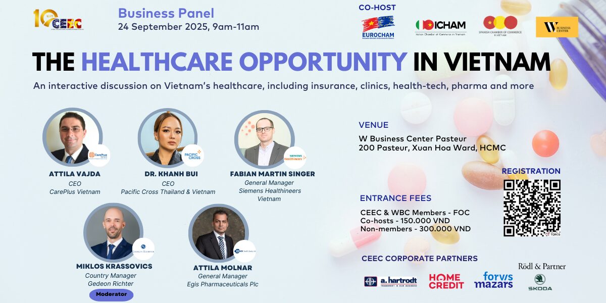 Join us for an engaging and insightful event Healthcare opportunities is Vietnam. An interactive discussion on the healthcare in Vietnam, covering private health insurance, clinics, health-tech, pharma market and more organized by CEEC and co-hosted by Eurocham Vietnam, Italian Chamber of Commerce (Icham) and Spanish Chamber of Commerce in Vietnam (SCCV) and W Business Center.